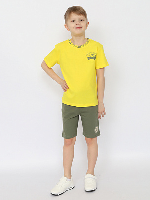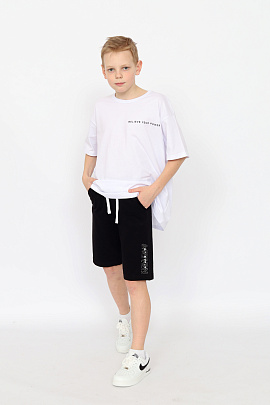 Шорты для мальчика из кулирной глади повышенной плотности. Верх шорт обработан притачным поясом из основного полотна, внутрь вставлена резинка и шнурок. На передних половинках расположен карман. Нижняя часть переда декорирована принтом.