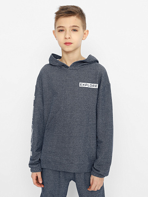Толстовка для мальчика с капюшоном со шнурком, карман-кенгуру. Манжеты и пояс из эластичной рибаны. На рукаве декоративная силиконовая нашивка.