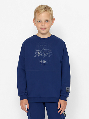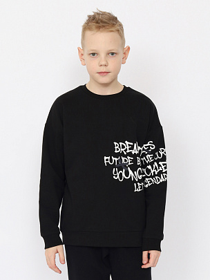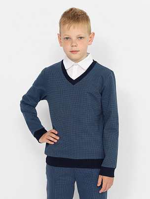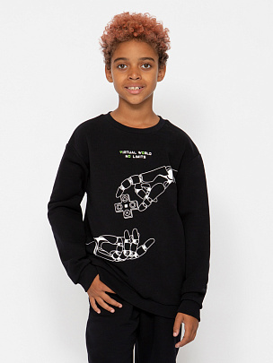 Джемпер с длинными втачными рукавами и притачными манжетами. Воротник, манжеты и пояс выполнены из полотна с эластаном. Перед декорирован принтом "Виртуальный мир без границ".