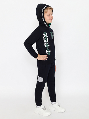 Толстовка с длинными рукавами, притачным поясом и манжетами. Манжеты и пояс выполненя из полотна с добавлением эластана. Капюшон с притачной планкой и подкладкой контрастного цвета, планка декорирована принтом. Перед декорирован принтом "тираннозавр Рекс".