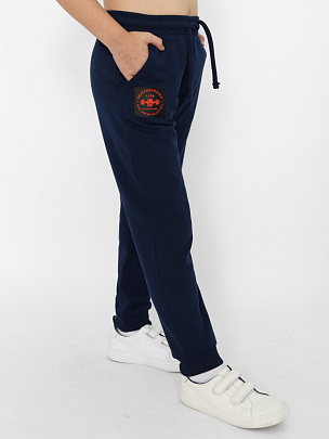 Брюки для мальчика с боковыми карманами и притачными манжетами из полотна с эластаном. Пояс притачной, с резинкой и функциональным шнуром. Спереди брюки декорированы жаккардовой этикеткой.
