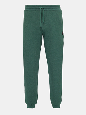 Брюки на манжетах внизу. Отрезной пояс выполнен из основного полотна. В поясе функциональный кругловязаный шнур вставлен в петли. Карманы наклонные в боковых швах. Декорированы жаккардовой этикеткой.