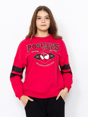 Джемпер для девушек с длинными рукавами оформлен в спортивном стиле. Свободный силуэт с заниженной линией плеча не сковывает движения. Нижние срезы переда и спинки оформлены притачным эластичным поясом. Рукава с эластичными манжетами по низу. Рукава и перед джемпера декорированы принтом "положительные эмоции".