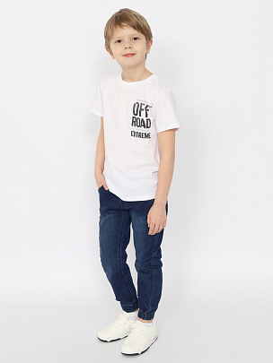 Футболка с коротким рукавом. Горловина круглая, обработана узким воротником из полотна с эластаном. Перед оформлен небольшим принтом.